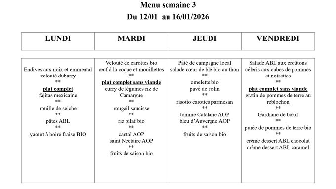 Menu du 12/01 au 16/01