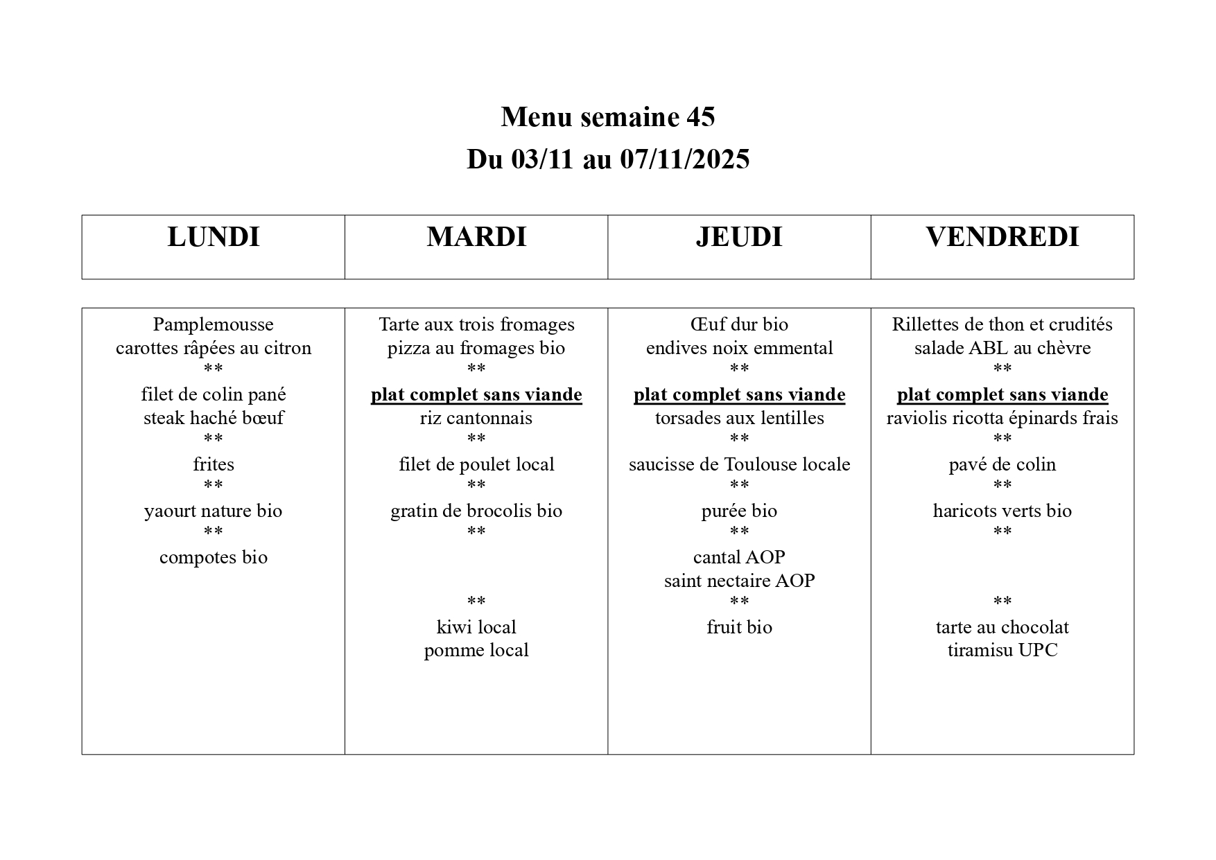 Le menu de la cantine
