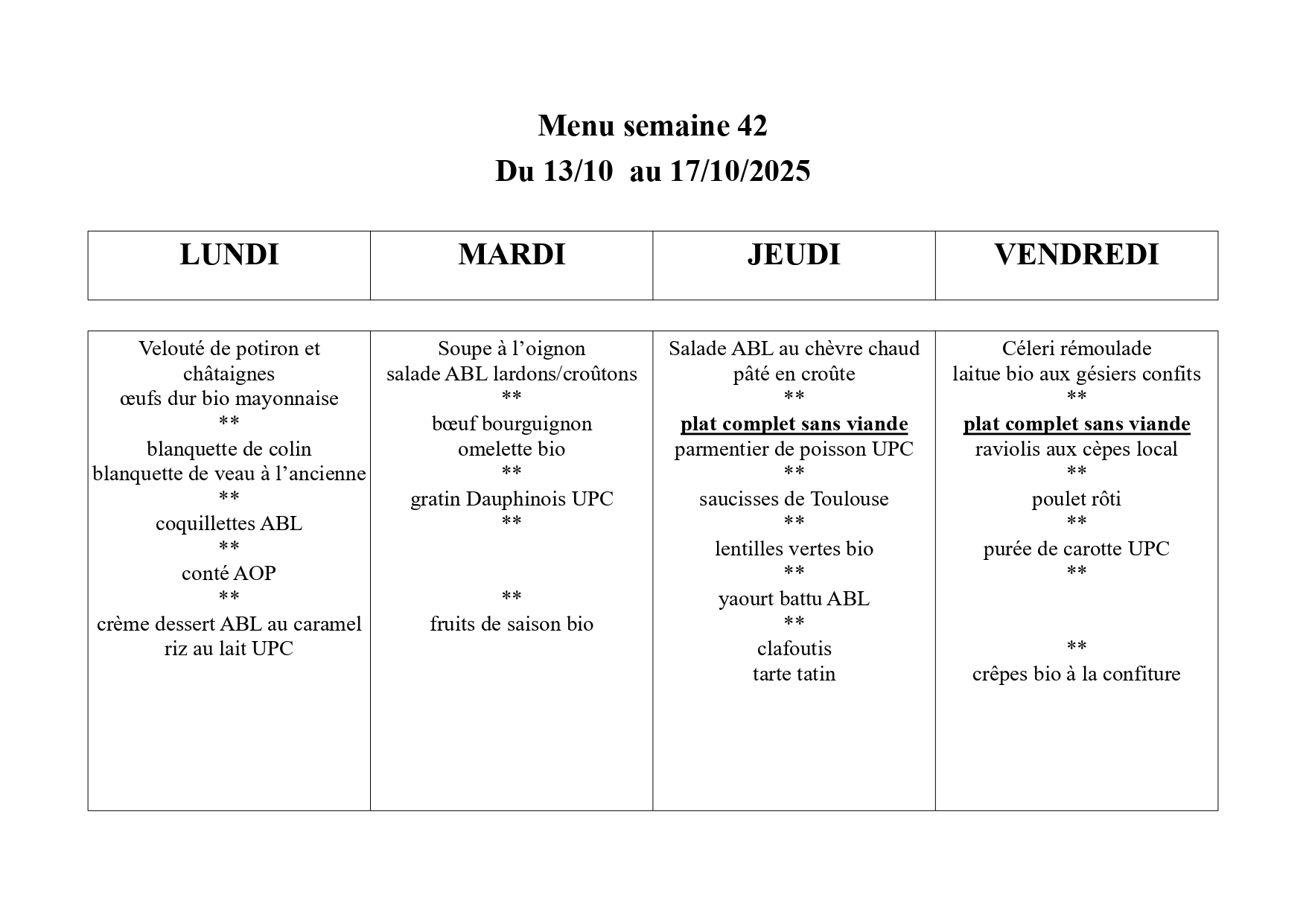 Le menu de la cantine